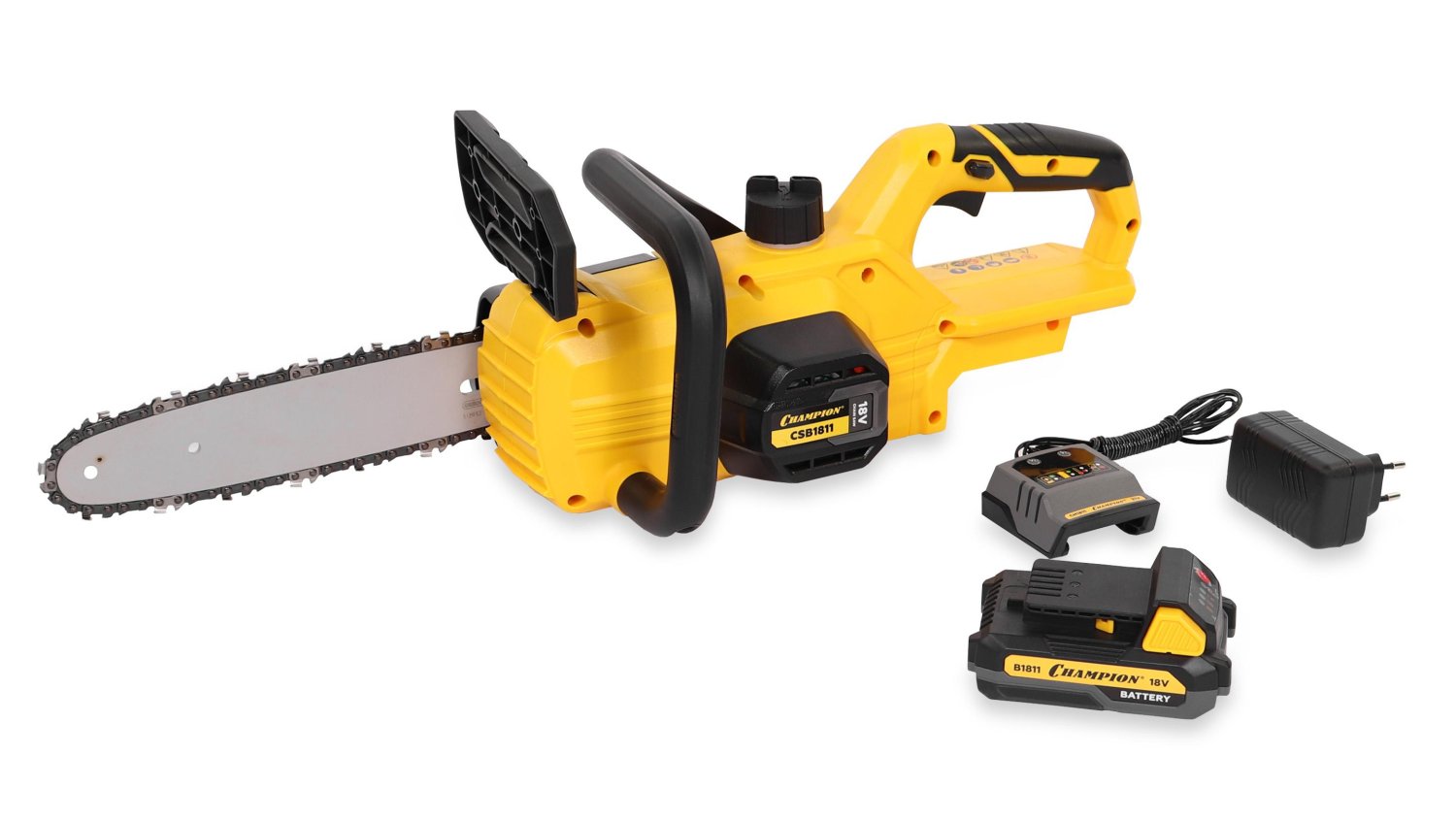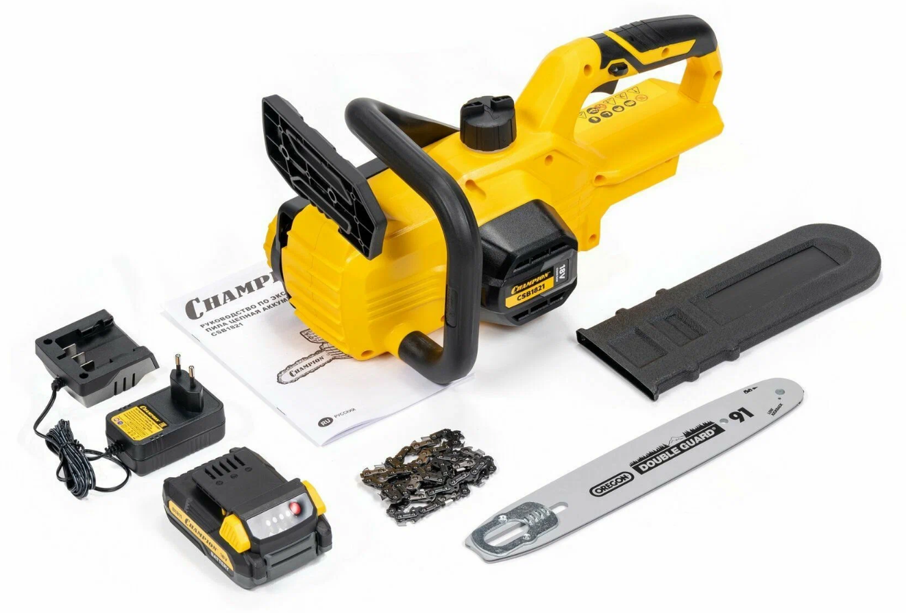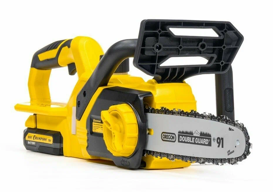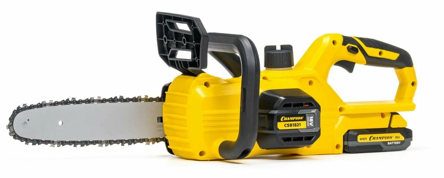 Аккумуляторная цепная пила CHAMPION CSB1821 имеет напряжение 18 вольт и оснащена бесщеточным двигателем. Продольное расположение двигателя позволяет эффективно использовать инструмент даже в труднодоступных местах. Модель оборудована бесключевой регулировкой натяжения цепи и защитой от перегрева. Также стоит отметить небольшой вес инструмента – всего 2,9 кг, что делает его очень мобильным и удобным в использовании.