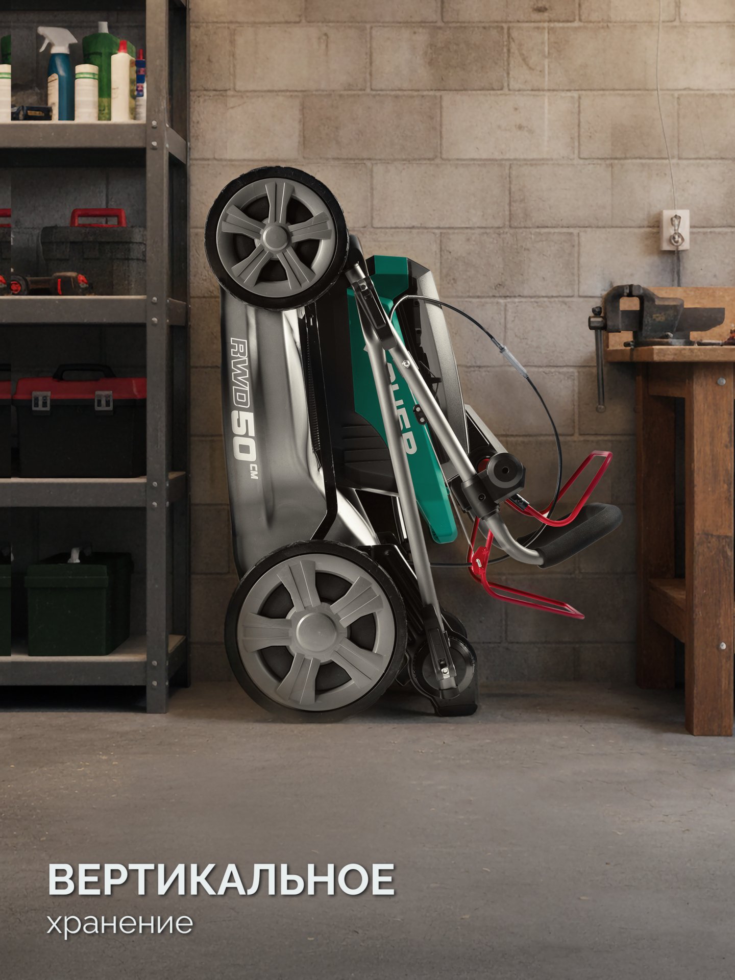 - Самоходное движение с приводом на задние колеса облегчает перемещение газонокосилки