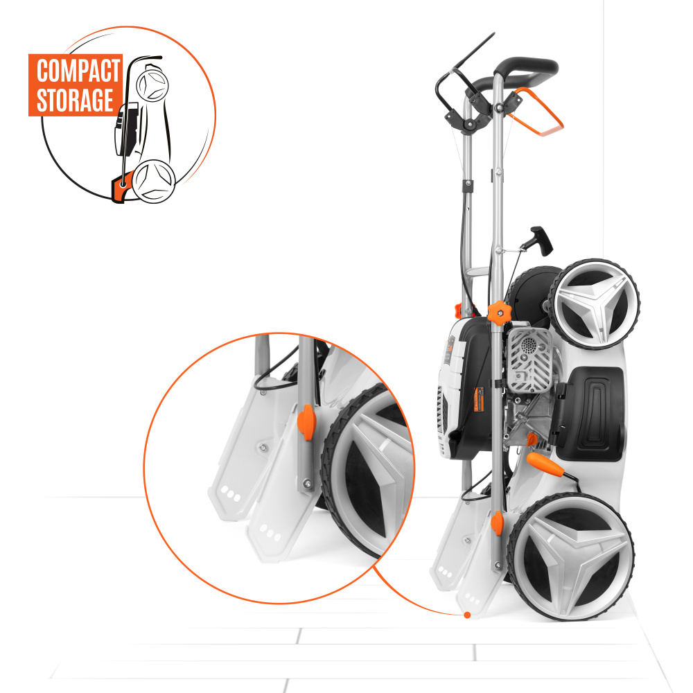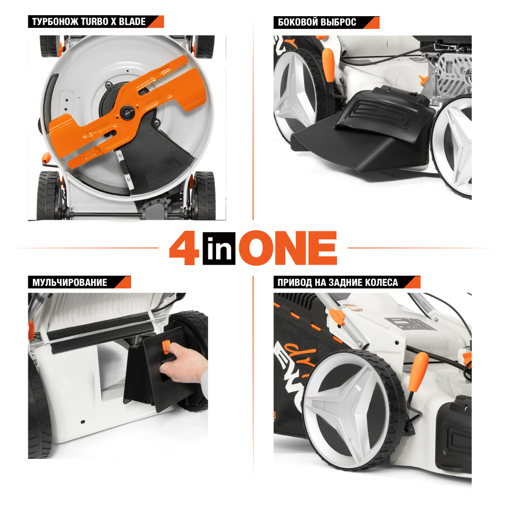 - 4 режима: кошение, боковой выброс, сбор в травосборник, мульчирование