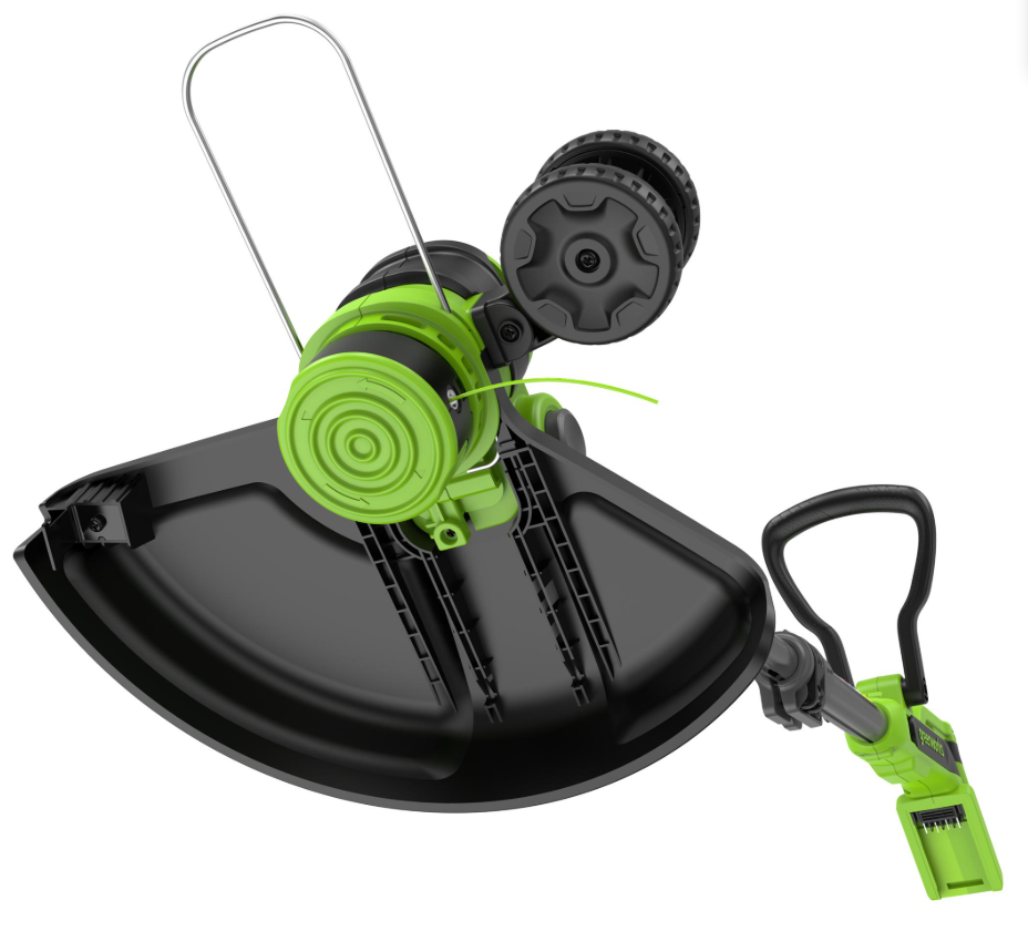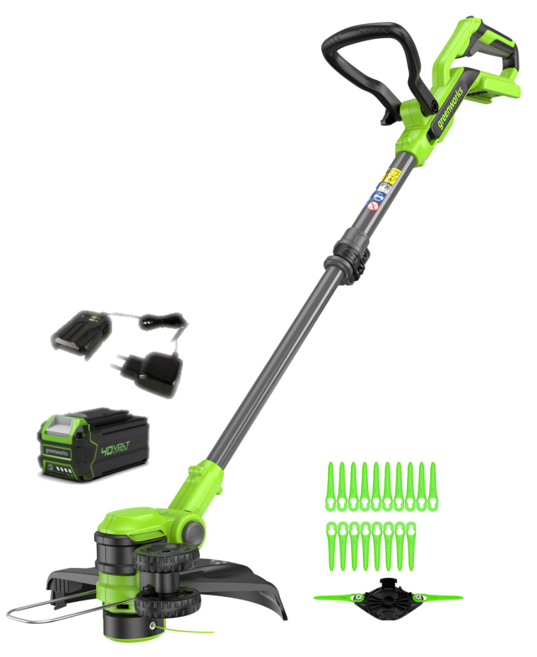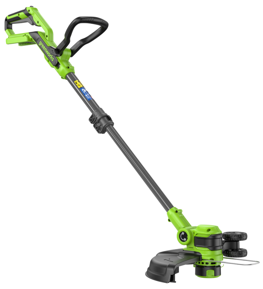 Триммер аккумуляторе Greenworks G40LT331 2113507UB. Устройство 2 в 1 – садовый триммер и кромкорез. Помимо головки триммера для работы с леской, в комплект входят 20 пластиковых ножей для эффективного скашивания травы и диск для их установки. В режиме подрезки кромок специальные небольшие колеса установленные на инструменте предохраняют от касания земли. Нижнее расположение двигателя даёт оптимальную развесовку – вес двигателя и головки с одной стороны уравновешиваются весом аккумулятора и ручки с другой. Угол наклона режущей части регулируется и имеет 7 положений, что позволяет оптимально настроить инструмент под рост оператора, а также эффективно использовать его в режиме подрезки кромок. D-образная рукоятка триммера регулируется по углу наклона и удобна для маневра в условиях ограниченного пространства. Скоба, установленная рядом с триммерной головкой, защитит окружающие предметы от контакта с леской.